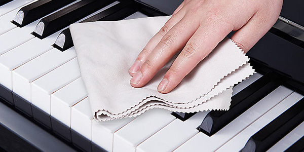 用微湿软布顺纹理擦拭琴键,勿用酒精。外壳可定期用钢琴蜡保养,内部积尘由调律师清理。